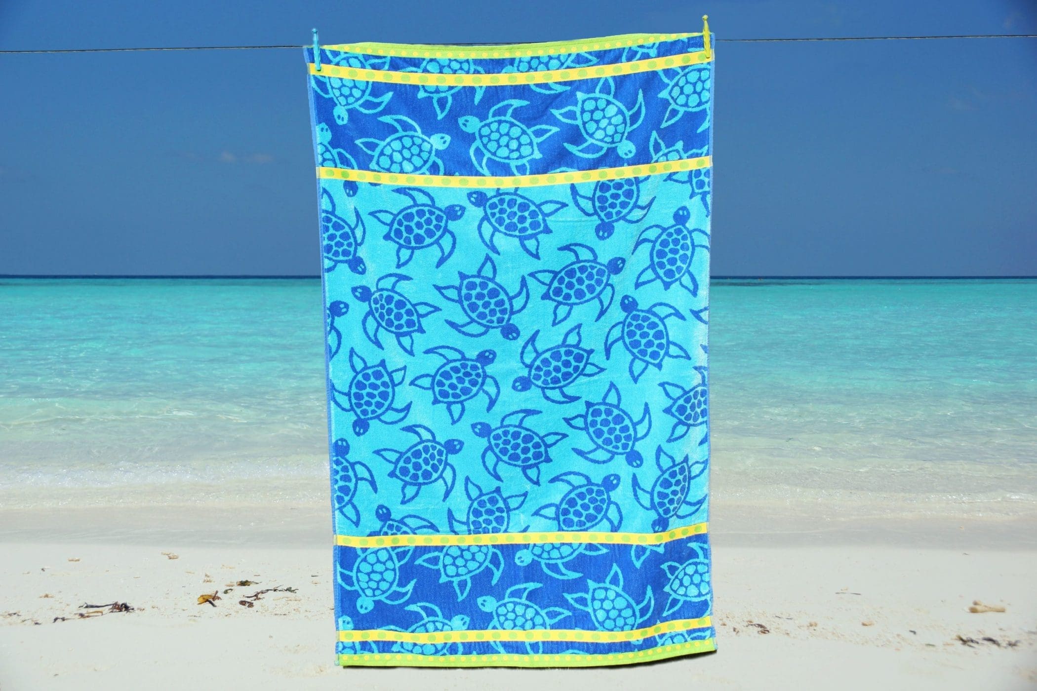Bring seaside energy to your next holiday with this beautifully bold Blue Turtle Beach Towel, designed to stand out and stretch out. Made from soft 100% cotton velour with a highly absorbent terry reverse, this oversized beach towel offers comfort, style, and practicality in one vibrant design. The tropical turtle print in calming ocean blues is framed by striking yellow and green stripes at each end – ideal for beach days, poolside lounging, or laying over a sun lounger with room to spare.