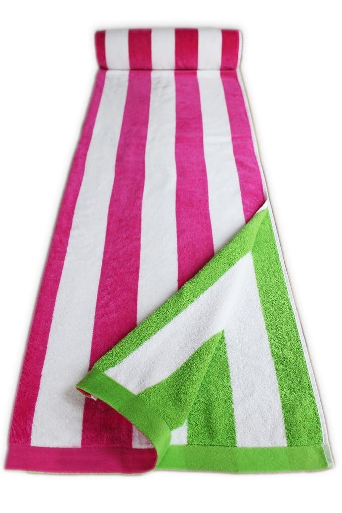Introducing our luxurious Pink & White Stripe beach towel. This large towel boasts a soft velour finish on one side and an all-over print design. Crafted with high-quality 400gsm yarn-dyed cotton, our beach towel is not only plush and absorbent, but also durable enough to withstand frequent use. The velour finish on one side provides added comfort and a touch of elegance, making it the perfect companion for your sunny beach days. Meanwhile, the Terry finish on the other side ensures efficient drying after a refreshing swim. Measuring 85 x 165cm, this beach towel is large enough to accommodate you and your beach essentials. Plus, it’s easy to care for and can be easily washed at 40 degrees Celsius. We recommend washing it once or twice before use to ensure its best performance. With its classic and stylish design, our beach towel is a must-have accessory for anyone who wants to enjoy the sun and sand in style. Don’t wait any longer, grab your striped beach towel today and hit the beach! Try pairing up with the Blue & white striped beach towel for a couples beach towel set 85 x 165 cm 100% soft velour cotton Reversible design with green & white stripe