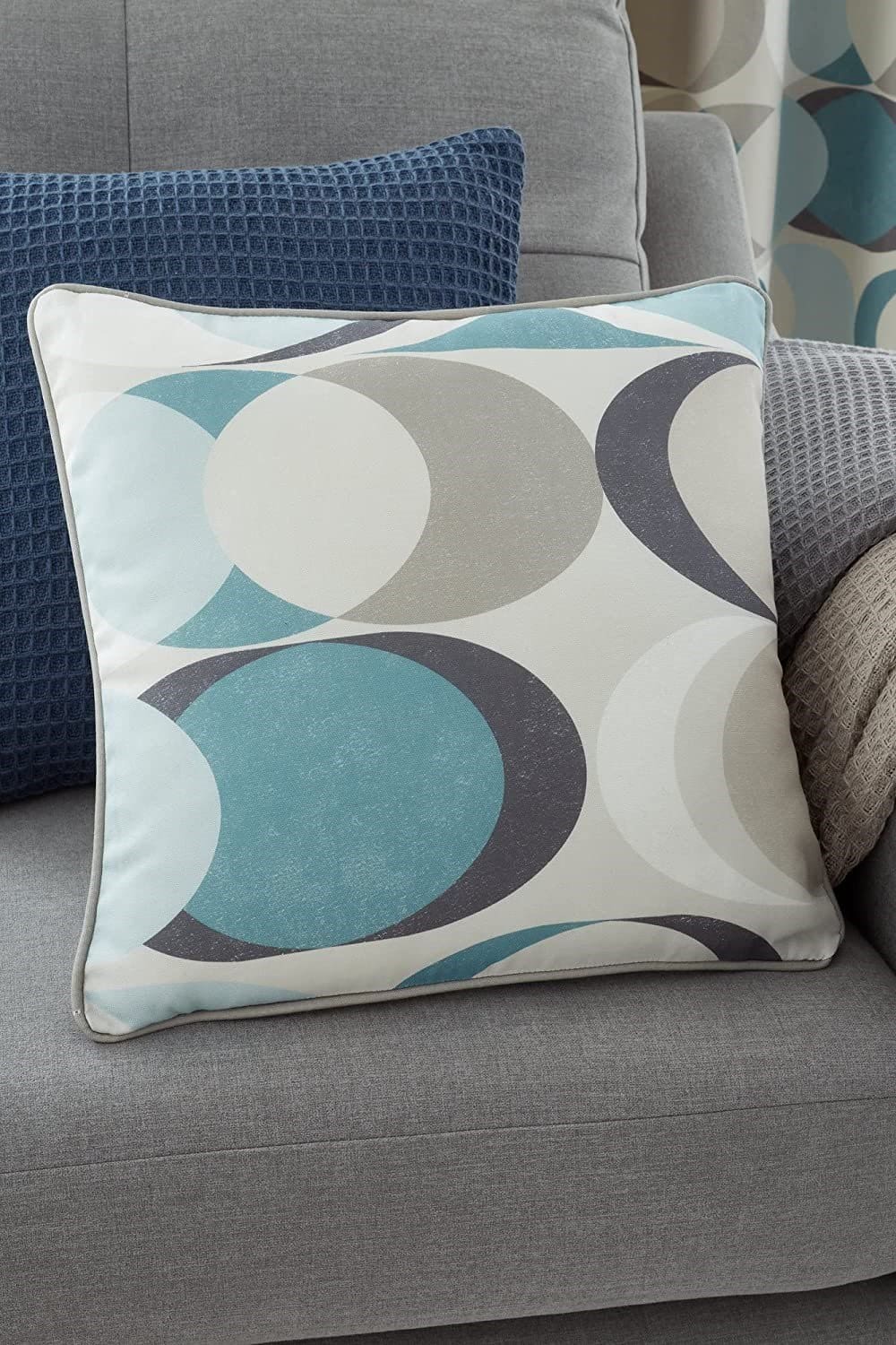 Offset circles abound in this fun screenprint-style design inspired by artwork and fashion of the 50s and 60s. The cushion’s outer fabric is manufactured from 100% printed cotton, with piping detail adds an extra stylish touch.